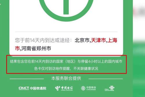 中国信息通信研究院官方微信公众号“通信行程卡”今天回应称,2020年11月10日0时起,行程卡将对包含中高风险区域的地市名称标记为红色,仅作为出行提示,不关联健康状况,具体管控政策请遵循各地联防联控机制。截至2020年11月10日10:00,标记提示的地区有:新疆维吾尔自治区喀什地区、天津市、上海市。