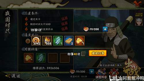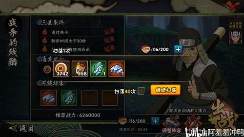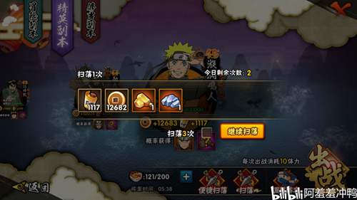 此时扫荡精英副本,一次得到2个材料,属于正常收益,此阶段过短,同第三阶段(已达到五星的BC忍跳过不扫)。