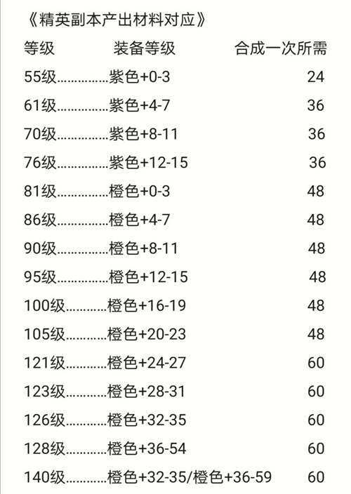 这个表就是各个等级扫荡精英副本掉落的材料,打个比方,比如你现在125级,那么此时你扫荡精英副本,得到的材料就是橙色28-橙色31的材料。