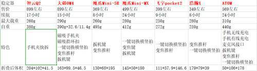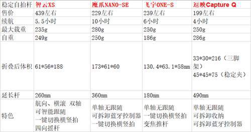 1、从售价来说 魔爪和飞宇的价格较低,大疆和智云的价格较高(表中价格是我收集资料时的京东价,仅供参考)
