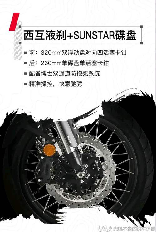 西互制动卡钳;博世ABS;全LED灯源;TFT液晶仪表;按键背光灯;滑动离合;改良手把护弓;铝合金边箱固定架。