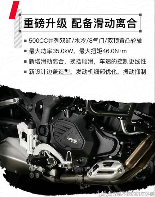 动力方面没有太多变化,同样的500cc并列双缸水冷发动机,最大功率为35kw,马力约为47.2匹,最大扭矩45Nm,国四的排放标准,动力国产同级别里挺不错的。