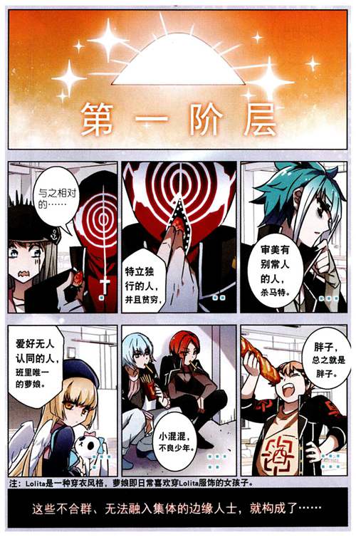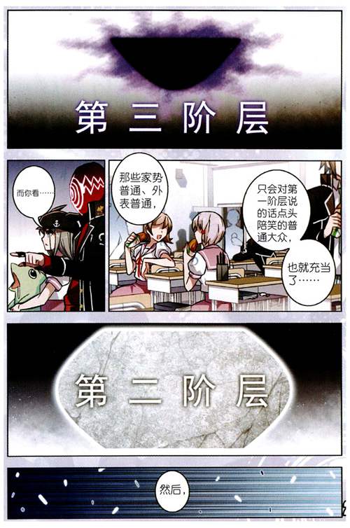 漫画中,阶级即是贫贵富贱的等级制度。阶级最高(第一阶级)的人享有巨大的社会资源,影响力,威信,人脉等。第二阶级依附于第一阶级,对第一阶级唯命是从。第三阶级被排挤在外(不合群,孤僻的人),游荡在班级边缘。漫画中,第一阶级的女主起先只是对帽子有好感,可以看作是第一阶级的人的爱好,但一旦确定为具体关系,女主就立刻为众人排挤,沦为第三阶级的贱民。就像在中世纪,贵族与奴隶间是不允许发生关系的。而且,漫画对阶级差距的描写也很详细,尤其是老奸巨猾的班长的心理描写。