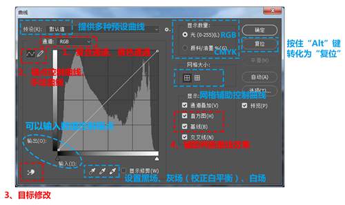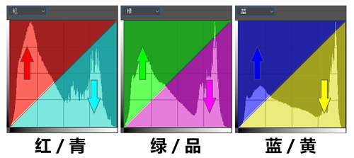 以对角线为参考标准,红原色通道中,曲线高于/低于对角线时,加红/青;绿原色通道中,曲线高于/低于对角线时,加绿/品;蓝原色通道中,曲线高于/低于对角线时,加蓝/黄。