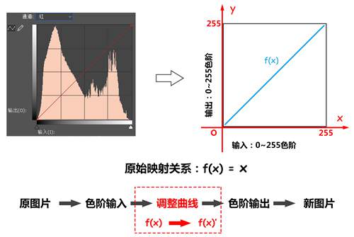 以红原色通道为例,不调整曲线时,原始映射关系为Y=F(X)=X,即为对角线,此时红色输出色阶值与输入色阶值一样,片子颜色不变。