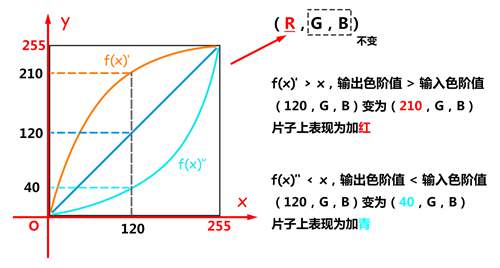 当调整红原色通道曲线时,只改变R的色阶值,G和B的色阶值不变。以输入色阶值120为例,当曲线高于对角线时,YX,输出色阶值为210,片子表现为增加红色;反之当曲线低于对角线时,YX,片子表现为增加青色。
