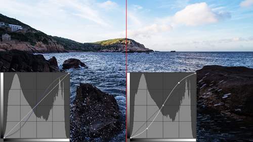 以片子加青为例,有两种方式可以实现,一是降低红原色通道曲线,二是同时提高绿原色、蓝原色通道曲线,但是两种方法会对片子产生不同的影调影响,第一种压暗,第二种提亮。