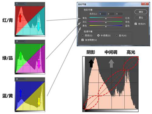 在灰度调整中提到了分区调整的概念,同样也适用于颜色调整。通过在对角线上添加锚点,锁定曲线相应的灰度,可以实现对阴影、中间调和高光局部调色,不正是色彩平衡调色命令么。