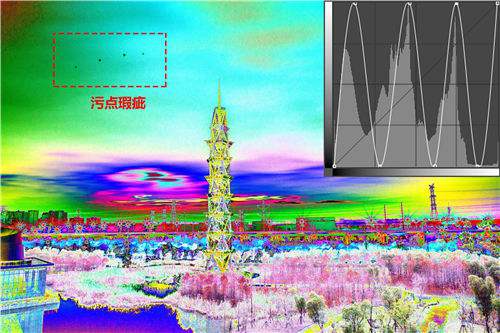 曲线形状类似正弦函数,称之为正弦曲线,刚刚还不起眼的污点瑕疵在正弦曲线施压下原形毕露。不难理解,正弦曲线由多条竖直线组成,竖直线的作用是增大反差,通过正弦曲线调整,污点瑕疵和背景之间的反差增大,自然显现出来。
