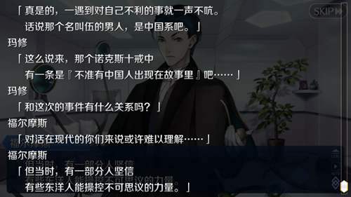 5、不准有中国人出现在故事里。(第五节的标题更改为不准有奇妙的东洋人出现在故事里面,不过在剧情里面玛修就提到了诺克斯十戒原话,这就是本期主要想讲的重点,无论是原来的十诫,还是FGO活动里面的标题,都不曾带有歧视的意义存在,主要是因为如果出现中国人作案的话,那么可能会出现使用中国功夫这种超自然,但是又能作解释状况出现,虽说现在可能广泛的中国人都不会功夫,但是真正的练家子确实有一两招可以致死的功夫,比如死者是被重物砸死的,但是现场找不到任何重物作为凶器,结果解释说是被中国人一掌劈死的,当然不了解这部分知识的读者会一脸懵,所以出现会功夫的中国人在推理小说里面是非常犯规的,在虚月馆里面就已经出现了燕青(伍)这种中国系从者,并且在剧情里面为我们展示了分身术,也就是说他如果想的话,所有虚月馆的人都不会是他的对手,因此燕青在这一节就已经被排除在凶手外面了。)