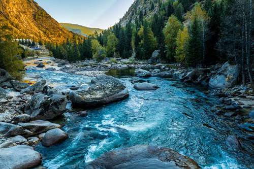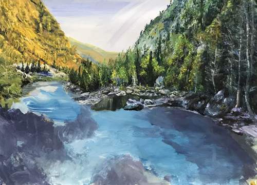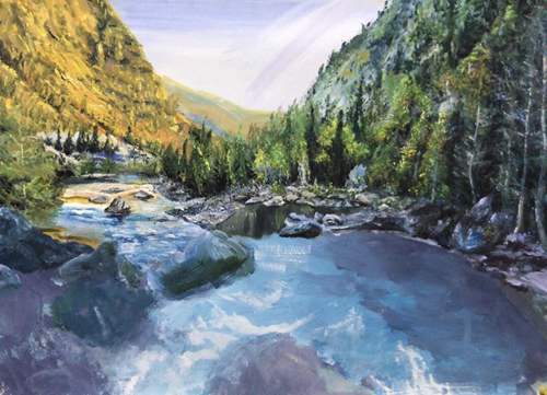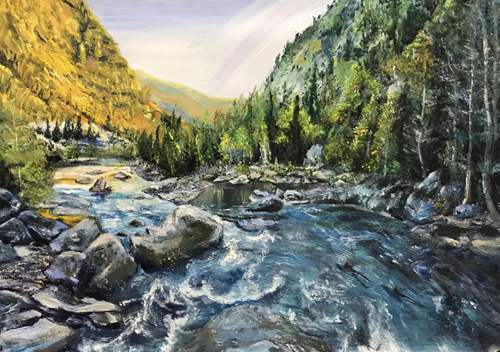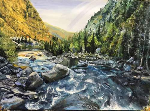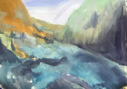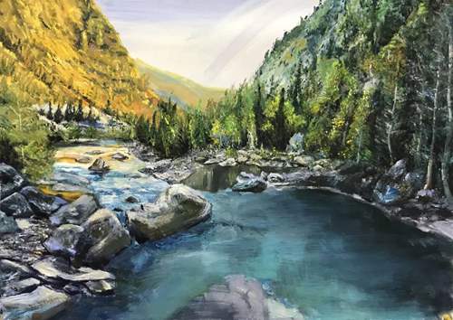 最后一个主角——水,水是透明无色的要画好水就要注意水周围的环境和整幅画面的色调。平静的水像面镜子一样,流动的水,倒影会拉长扭曲,若隐若现,所以用笔要飘逸,干脆利落。用干笔沾取白色、钴蓝、湖蓝、天蓝、浅灰蓝,用扫的方式,注意用笔方向要根据水流方向而定。再用大量的白色画出浪花,要有疏密氛围,在岸边适当的画一些小石子。