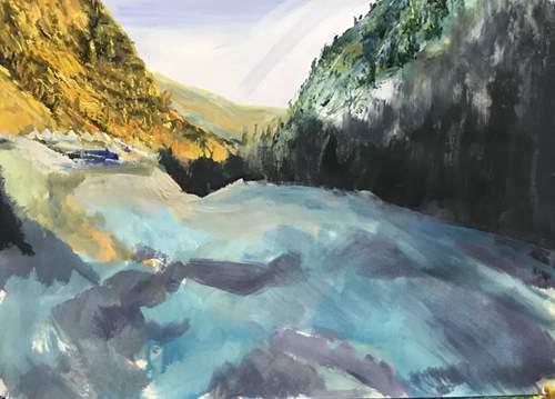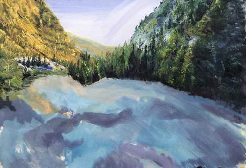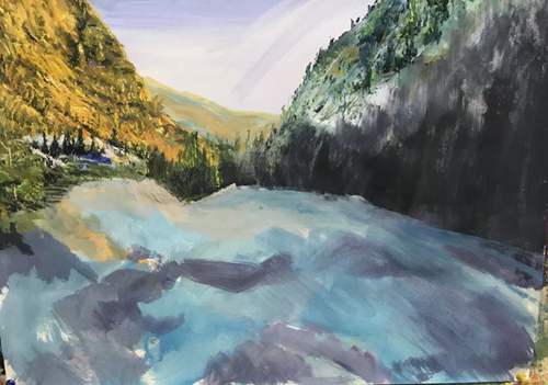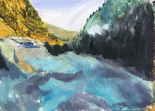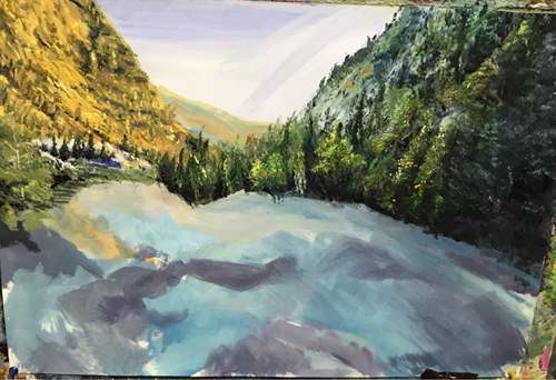 之后,把远处的山(左)进行刻画,分析山坡的走势以及树的走势。树要有投影、亮部、暗部。注意疏密节奏,明暗对比关系,冷暖关系。可以适当地在暗部加一分淡紫色。并且山脚有房屋也要绘画出。近处的山(右)先铺大色块然后画一些山坡上的小树,近处的树铺一层暗部。
