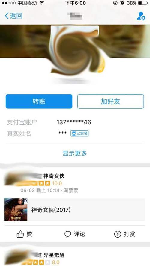 从以下截图可以看出,截图中的妹纸平时挚爱化妆品,喜欢蕾丝材质的衣服,除此之外,可能还喜欢经常换手机壳。在支付宝里,她在哪一天看过什么电影都能看到,尽管你并不是她的支付宝好友。