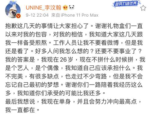 特别是12日凌晨李汶翰微博发文声明:单身,事业为重!