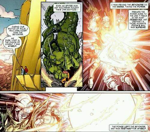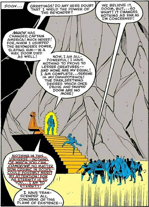 窃取了Beyonder力量的Doom此时已经太过强大,超越了所有人的想象,宇宙中的一切都不再值得他关注,永恒对凡人来说意味着什么,他对于永恒就意味着什么,他的一个念头就能决定所有人的生死,一个想法就可以改变所有的一切。