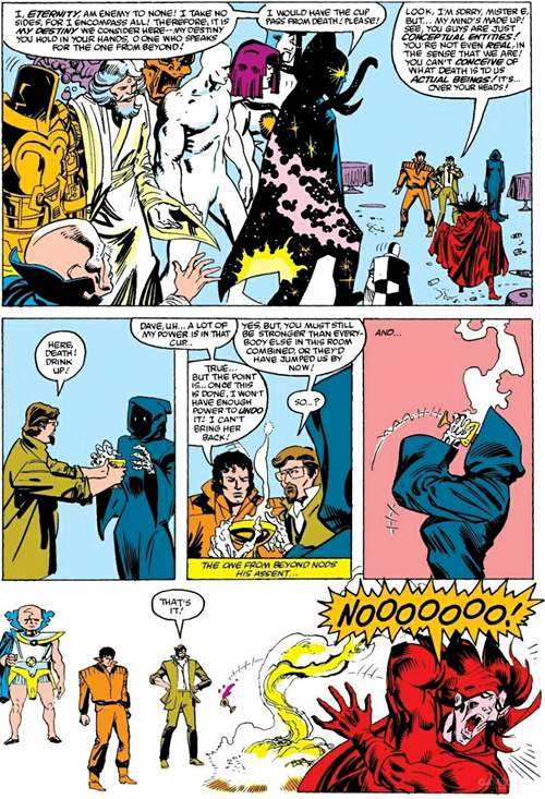 但是Dave认为这些人格化的神明根本无法理解人类这种感官生命的对死亡的恐惧,于是他拿起超越者的酒杯,让死亡女神喝了下去。