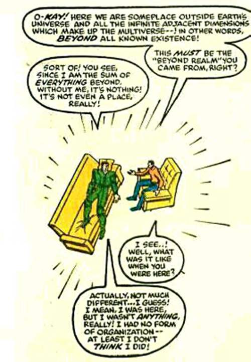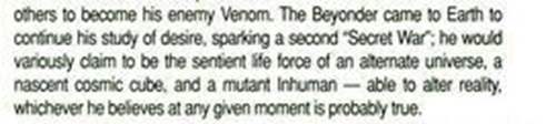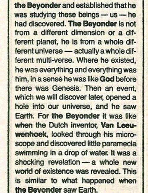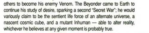 SL: Beyonder is supose to represent the power the writers themselves have over the comics和. the purpose of his original existence was to explain the existence of the other comic companies and their own universal laws and structure with their own supreme beings.