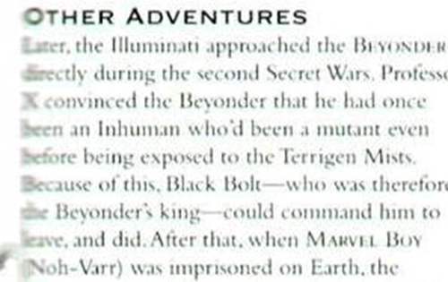 如果前俩个觉得时间太久了,这还有个官方15年最新声明Early on I talked with Brevoort about this and my understanding is that the editorial position regarding the New Avengers: Illuminati [miniseries] Bendis wrote was that it was all a construct of that Beyonder. It was all unreliable narrator stuff and he wasnt Inhuman. I think thats clearly the way weve gone, but I dont know that Marvel would think theyve ever moved off this path. It was just Beyonder shenanigans.