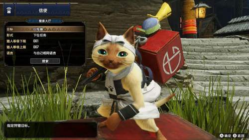 在中心广场的NPC“信使行千里”,一只踩着红色箱子的猫处,玩家们可以通过 线上游戏 → 寻找大厅,精确找到想要狩猎同一只怪物的玩家们。