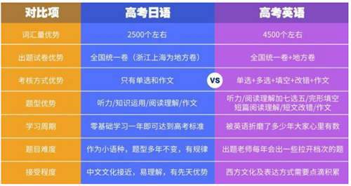 从数据看,不管是词汇量还是题型,日语都占有绝对的优势。日语的高考试卷为全国统一卷,为了照顾教育落后地区和许多自学日语的考生(日语教师的资源少),试卷命题相对简单。