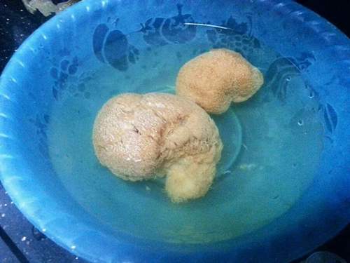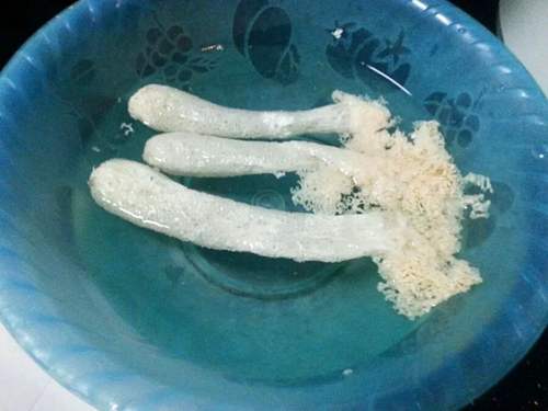 2.将竹荪浸泡在盐水中。稍微膨胀后,去除竹荪表面的白色杂质。去除杂质时要小心,以免损坏竹荪。