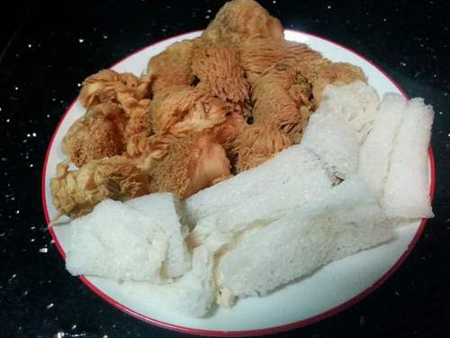 5.猴头菇洗净后,挤出水,撕成小块;将竹荪的尾巴去掉,切成段。
