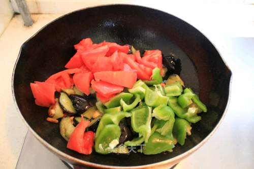 7.放青椒和西红柿,加一勺白糖和适量的盐调味,大火翻炒均匀,中途可以少加一点热水炒制西红柿变软出现红色汤汁。