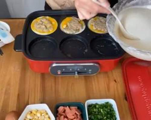 4、有朋友反映做出来的分层,大家注意2点就可以啦!那就再啰嗦一下,补个慢动作细节。⚠️⚠️⚠️1.肉馅和鸡蛋结合时,鸡蛋是半凝固的状态。内馅放在面糊上时,面糊倒入就可以放上了,不要等面糊熟了再放。2.内馅放在面糊上后再轻轻的按压一下,让面糊溢上来把周围填满。最后的最后大家面糊一定不要倒太满哦,不然会像我第一次一样翻车。