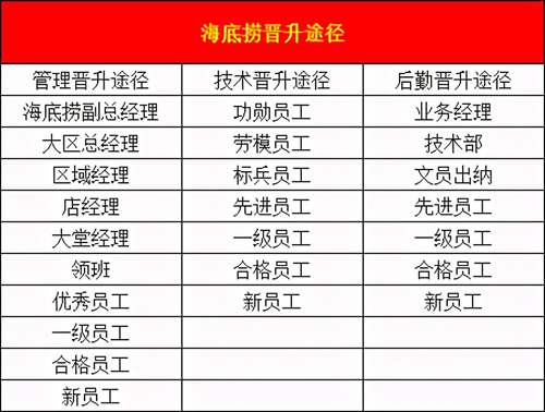晋升体系:餐饮三效服务数据连续四个月或累积五个月保持领先;(人效=总营业额÷员工总数;地效=总营业额÷全场面积;椅效=总营业额÷总餐位数)培养副店长并确保三个月后具备店长能力;这是店长晋升区域经理的标准。基层员工基本一个半年、一年考核一次晋升,级别越高考核时间越长。量化标准越高。应聘时如果直奔店长位置去,结合目前的扩张速度,基本1-2年就可以荣升店长。