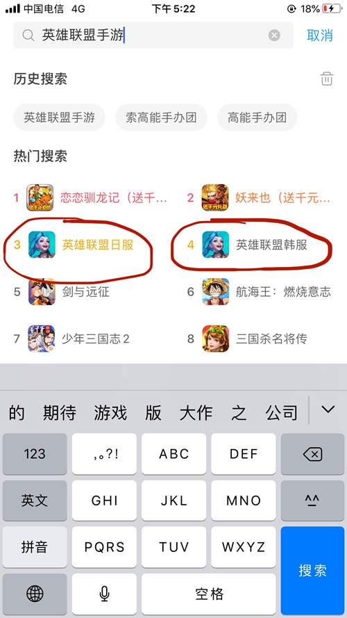 你也可以直接在热门搜索中就可以看到英雄联盟手游,有日服和韩服。