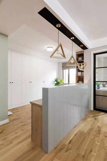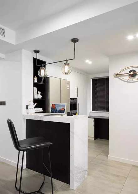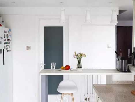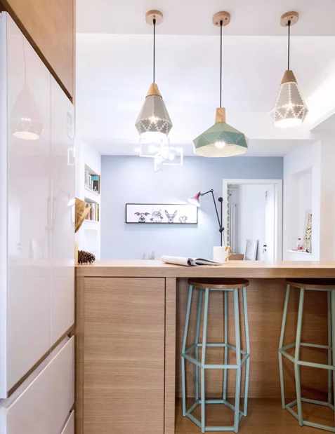 不知道厨房区域如何分割?除了推拉门之外,喜欢开放式厨房的朋友则可以选择做个小吧台,它也可以成为用餐区,这样一来不仅貌美而且有效提高了空间利用率。