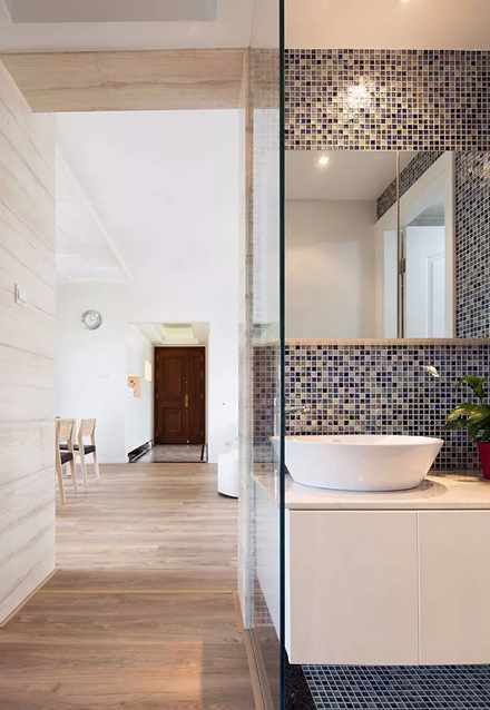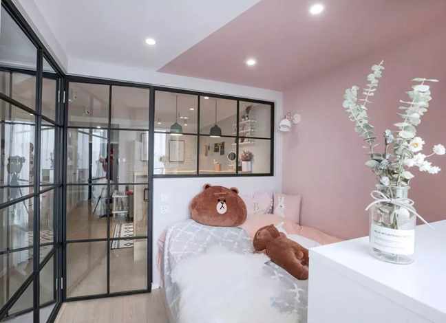 对于喜欢有明确隔断效果又不高兴砌墙的朋友,玻璃隔断则是一个很好的选择。隔音效果和隔断感都比较强,同时又因为玻璃的材质让家里看起来依旧通透明亮。