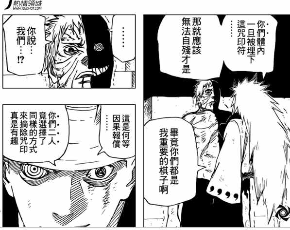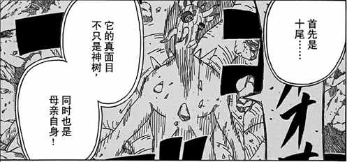 黑绝这段话的意思就是斑吸收的神树=十尾=辉夜,六道斑的不死之身和额头上的轮回写轮眼都是来自大筒木辉夜,当六道斑被体内十尾诱惑吸收掉神树后,斑体内辉夜的意识就得到苏醒。黑绝针对性的阴阳遁·精神附体·同化再加上中了无限月读的忍者联军的查克拉和吸收了神树的十尾人柱力的身体三者触为一体后辉夜就复活了