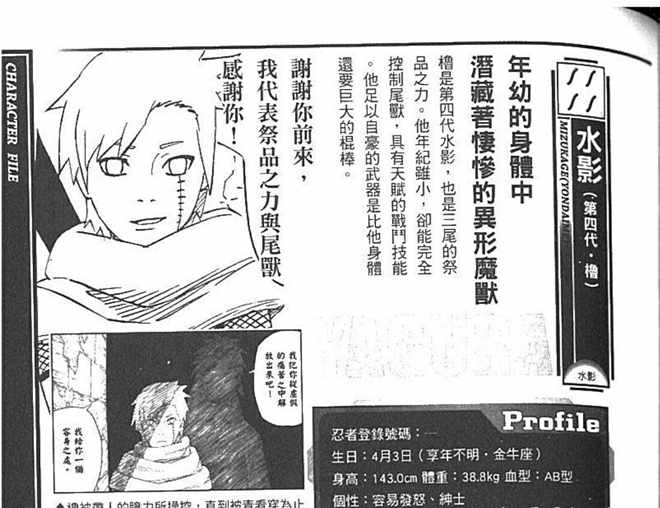 完美人柱力,能够完美控制尾兽,精通水遁系忍术,具有天赋的战斗技能。