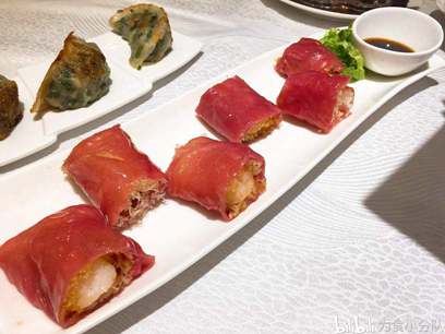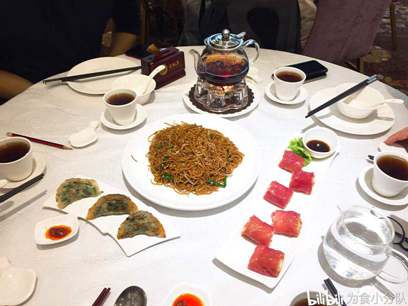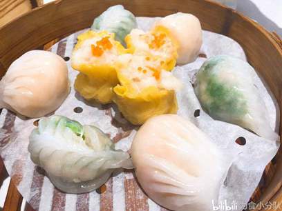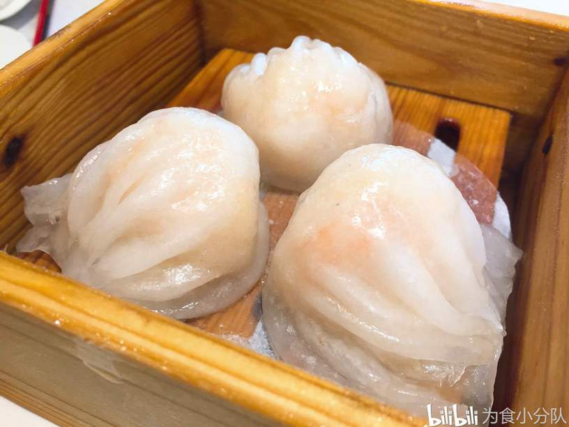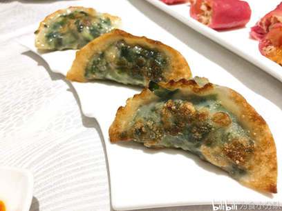这个是由虾饺、烧卖、香菜饺子三拼而成的茶点。虾饺是上边一样的,所以就不多做介绍。香菜饺子皮薄透明,但吃下去没什么感觉,味道一般;而烧卖色泽金黄,里馅料十足,肉混合着鲜虾,再配上少许的蟹籽,入口爽口,也不会在咸,所以过得去,总体上有四星。