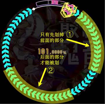 (7)slide的判定结果与过程无关。想得到完美判定,只需在星星头进入slide的最后一个判定区时把slide划完。这就可以解释为什么很多人在处理慢速slide或者贴边一圈的slide时,会先把前面的部分划掉,等星星头到了之后再触摸slide最后剩余的部分。但对于这种星星,新手前期并不需要记判定区的位置,因为只要不是特别慢的星星,手跟着星星头划就没错。