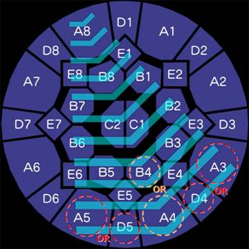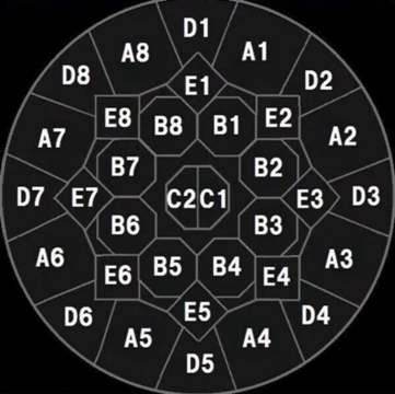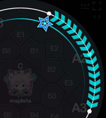 A区是最贴近按键框的判定区,每一个按键对应一个,也是内屏玩家触摸tap、hold音符的区域。由于slide皆由某个键指向某个键,所以它们一定会从A区出发。原则上需要依次触摸slide经过的判定区,然而,在实际的游玩过程中,A区可以是免判的,即你不需要触碰slide开始的A区,就可以判定完整条slide。对于会在slide划动过程中在启动键位继续出键的谱面(典型的有FREEDOM DiVE (tpz Overcute Remix) Master难度,如图1-20),避开A区划动slide可以避免将tap蹭绿。