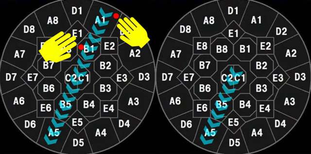 例如要求用两手交叉去按同一侧的卡手hold,由于这样使得另外一侧的手需要越过中线来到另一侧,动作幅度较大,新人比起交叉手,很可能更倾向用一只手硬抗。养成交叉手的习惯有助于你快速掌握键盘走位的感觉。
