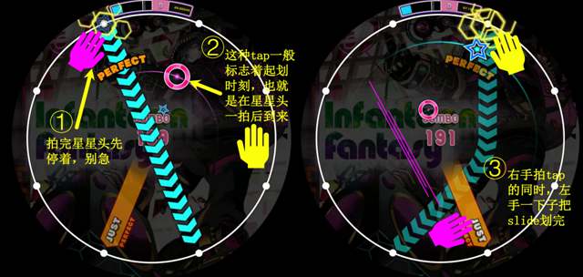 如果时间允许,每一个星星音符都先别急着确定划slide的手。集中注意力,观察tap的出没位置,即时判断划slide手。如(1)中提到的情况,如果改成tap从左边出现,那划slide的手又是右手合适了。风车星星中也不是每一个星星音符都要换手,如起手、结束、与对称轴相邻的星星,视具体情况而定。