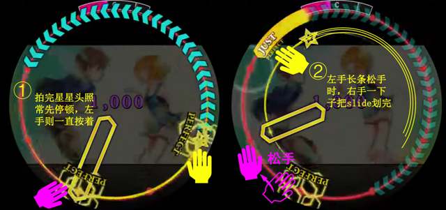 (1)星星音符分为星星头(tap)和 划条(slide)两部分。星星头和其他形状的tap的判定形式没有区别,都是等它到达判定线时击打即可。