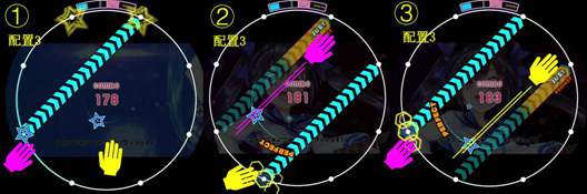 配置(3)笔者愿将其称为“死亡镰刀”配置。因为其在《Death Scythe》这首歌的Master谱面中大量出现。对于“死亡镰刀”配置,接下来笔者选择对《明星ロケット》的Master谱面副歌部分进行讲解。