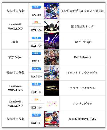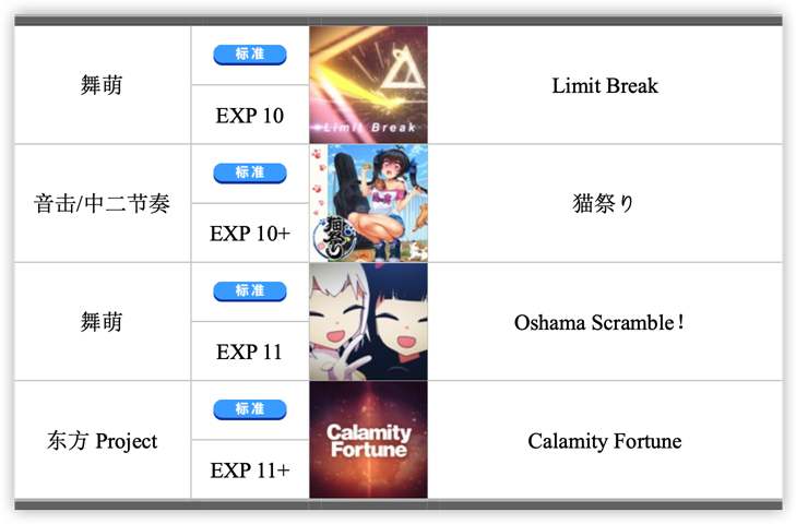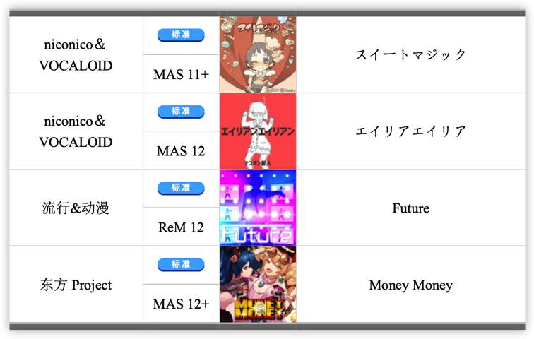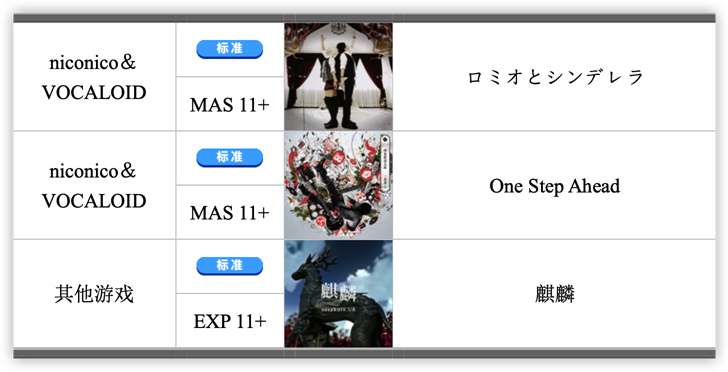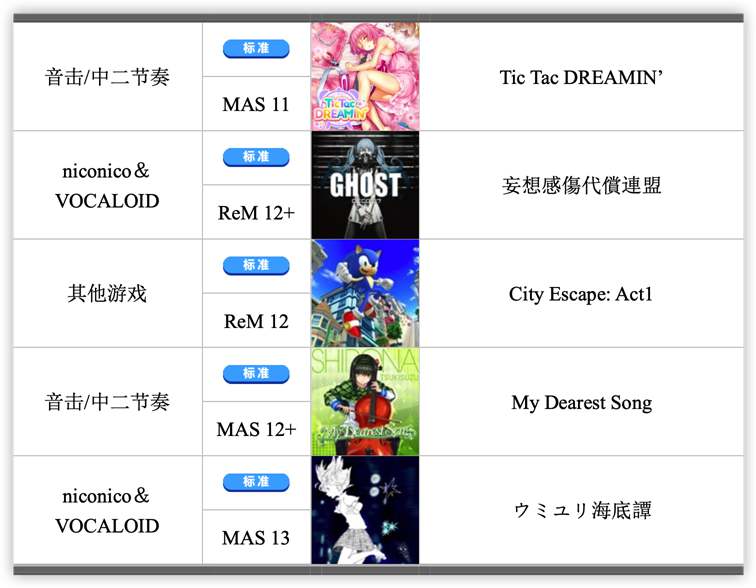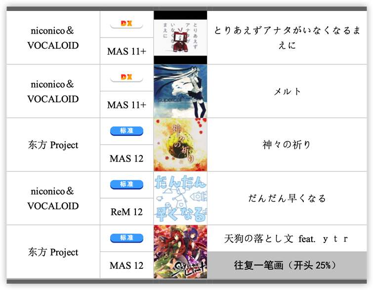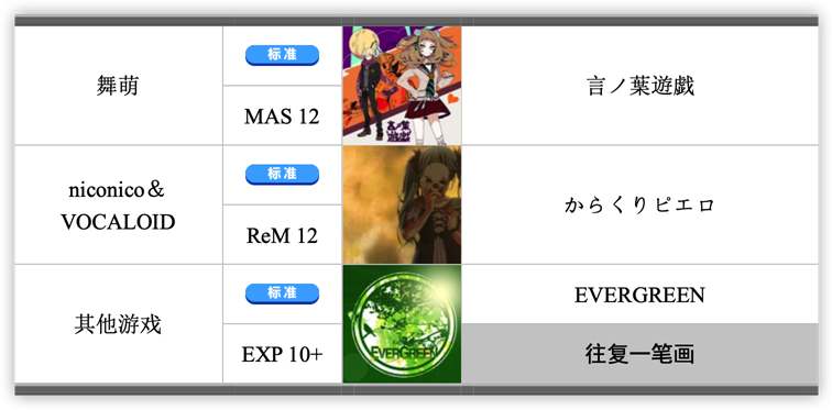 笔者未评测7级之前的谱面,7~9级主要评测了GreeN PLUS代之后的谱面,9+~12级的所有谱面基本评测完毕。推荐谱面不代表这个配置仅有这个难度区间的这些谱面,而是笔者综合考虑了适合练这个配置的阶段、配置在谱面中的占比、谱面中其他配置的难度、歌曲悦耳程度之后进行的筛选。