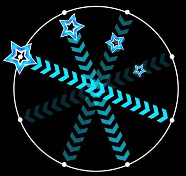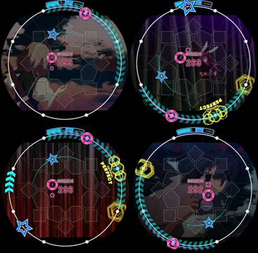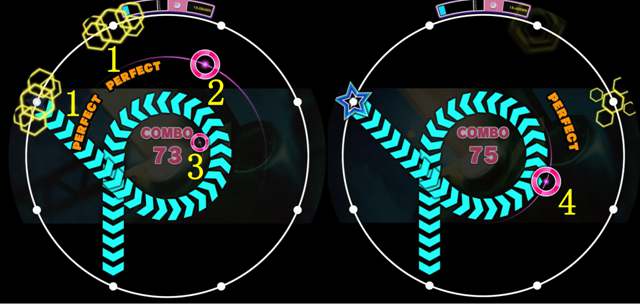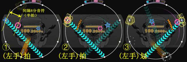(3)一圈音符(有tap有星星头)从连续的键位飞出,同时星星头引出的slide方向与出键方向相反;