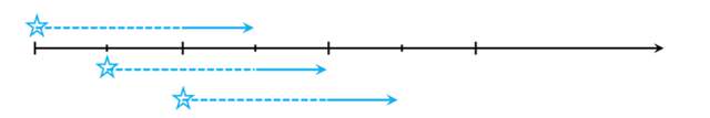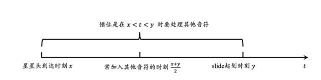 (2)星星头准备到达判定线时,屏幕上会显示从星星头的位置引出的划条(下称slide),随后星星头会沿着slide运动,引导你跟着它划slide。拍了星星头之后,并不是立刻开始划slide,而是停顿一下再划。停顿的时间为一拍。时间轴上开始划slide的时刻,称为“启动拍”。