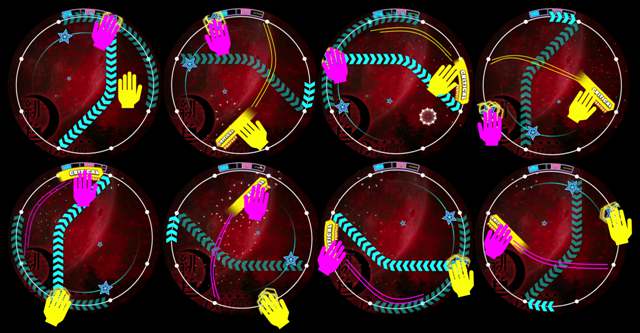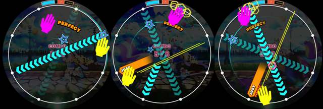 (8)有种扇形的slide会从起点放出三个星星头,这个扇形的辐射区域形似Wi-Fi,所以被称为“Wi-Fi星星”。Wi-Fi星星只需要经过中央的C区与终点的三个感应区,终点的三个都得划到,最后的三组判定区中每组都摸到一个就算判定成功,即图1-5中OR连接的三组判定区。此类星星跟随星星头速度,张大手擦拭覆盖区域即可。