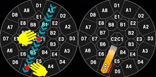 举个例子,如图1-4,你只要触碰了A1、B1感应区内的任意的两个点,触发了这两个感应区,slide就会直接变成右边这样: