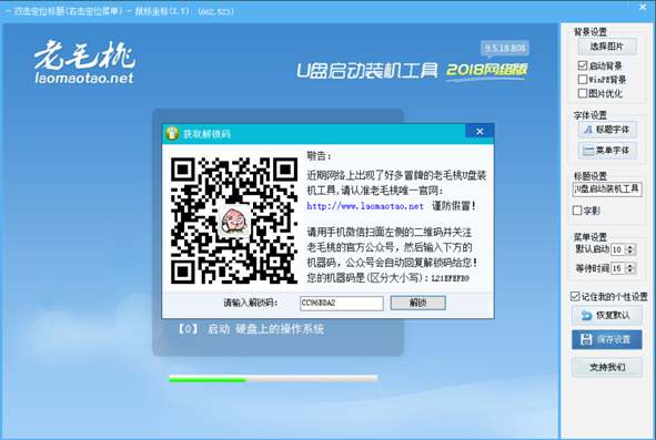 将所有勾去掉(这样安装系统不会捆绑安装其他软件,纯净安装系统),点击保存设置,然后弹出获取解锁码页面(获取解锁码需要关注老毛桃官方微信)