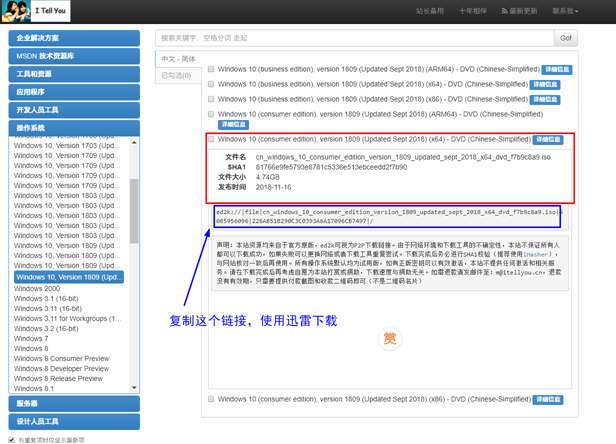 我们这里选择Windows 10, version 1809 (Updated Sept 2018) ,Windows 10 (consumer edition), version 1809 (Updated Sept 2018) (x64) - DVD (Chinese-Simplified),这里说明一下系统的版本