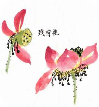 残荷的特点是花瓣凋零,花瓣颜色不鲜艳,莲蓬较大,莲子突出,花蕊低垂。画时花瓣颜色可稍加一点墨或者花青,莲蓬用藤黄调绿色。