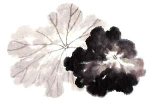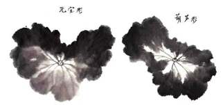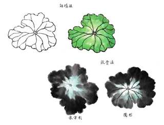 没骨法:用羊毫大笔蘸淡墨(或者用花青调墨),笔尖蘸浓墨,从荷叶外围向中心画出,也可从中心往外画出,并无定法。半干时勾叶筋。